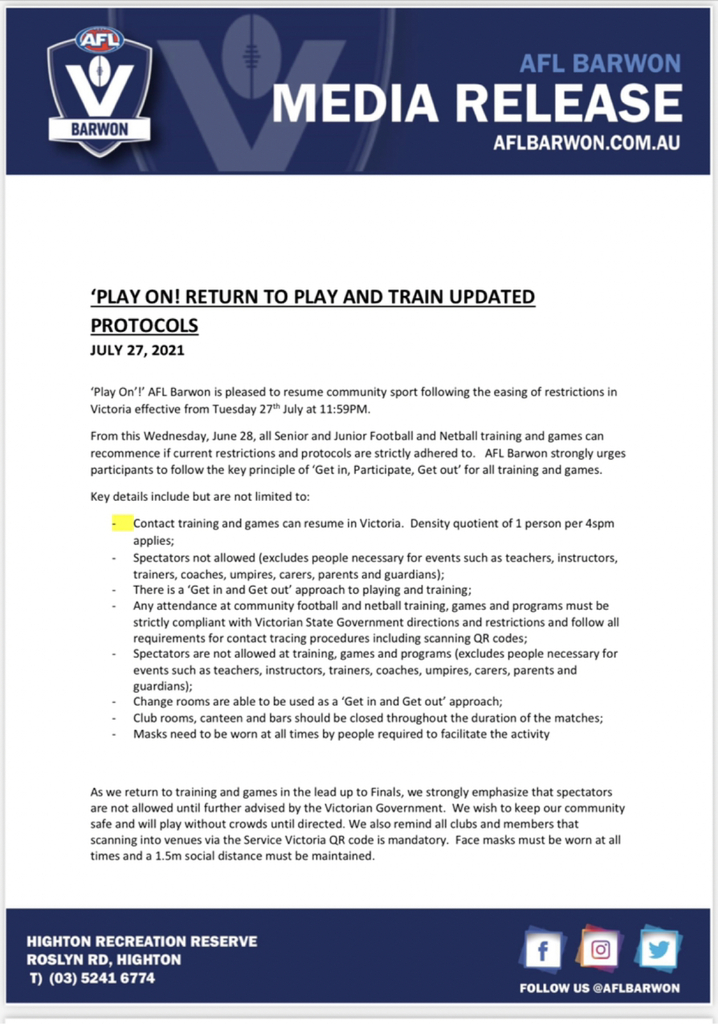 The Victorian Government has revised the lockdown laws and with effect midnight tonight we will be able to return to training and play from Wednesday albeit with some restrictions detailed in the attached media statement.